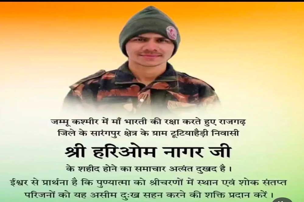 मुख्यमंत्री डॉ. मोहन यादव ने जम्मू-कश्मीर में अपना कर्तव्य पालन करते हुए सर्वोच्च बलिदान देने वाले सैनिक श्री हरिओम नागर को विनम्र श्रद्धांजलि अर्पित की है। मुख्यमंत्री डॉ. यादव ने कहा कि उनकी संवेदनाएं शोकाकुल परिजन के साथ हैं। मध्यप्रदेश की माटी के वीर सपूत का सर्वोच्च बलिदान मां भारती की सेवा और रक्षा के लिए सदैव देशवासियों को प्रेरित करता रहेगा। मुख्यमंत्री डॉ. यादव ने बाबा महाकाल से दिवंगत आत्मा को अपने श्रीचरणों में स्थान देने के लिए भी प्रार्थना की है।