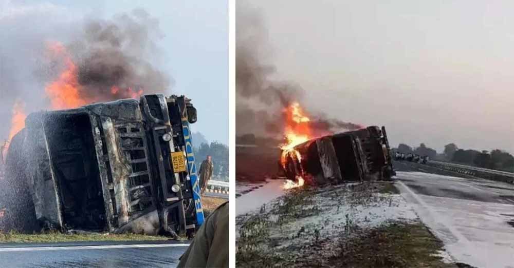 जिले के जयपुर बरेली हाईवे पर बुधवार सुबह एक केमिकल से भरा टैंकर मनोहरपुर गांव के पास बेकाबू होकर पलट गया। पलटने के बाद केमिकल से भरे टैंक फट गए। जिससे भीषण आग लग गई। धमाके की आवाज और आग की लपटे देखकर आसपास के लोग मौके पर पहुंचे। टैंकर राया की ओर से नेशनल हाईवे की तरफ जा रहा था। लोगों ने दमकल विभाग को सूचना दी। इसके बाद दमकल की पांच गाड़ियां और रिफाइनरी की टीम में मौके पर पहुंची। आग पर काबू पाने की कोशिश में जुटे एफएसओ किशन सिंह और फायरमैन शकीरा झुलस गए।