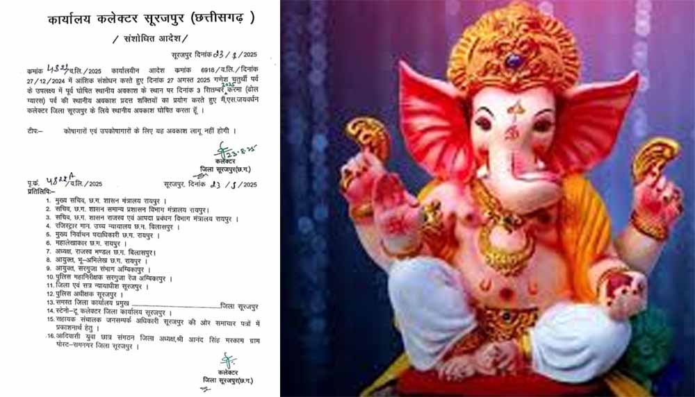 छत्तीसगढ़ के सूरजपुर जिले में कलेक्टर ने गणेश चतुर्थी का अवकाश रद्द कर दिया है. कलेक्टर एस जयवर्धन ने आदेश जारी कर 27 अगस्त यानि गणेश चतुर्थी को पूर्व में घोषित अवकाश को रद्द कर दिया है. साथ ही तीन सितंबर को मनाए जाने वाले करमा जिसे ढोल ग्यारस भी कहा जाता है को स्थानीय अवकाश घोषित किया है.