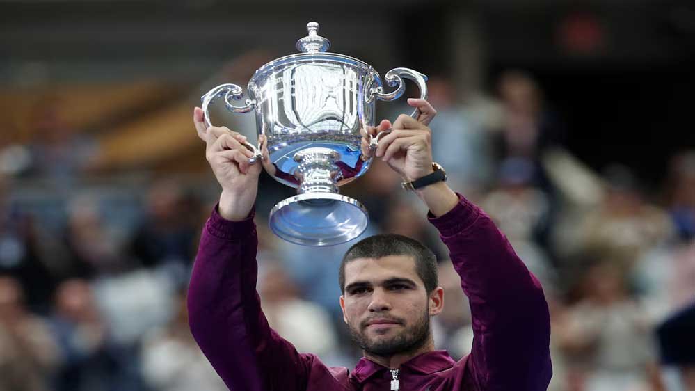 कार्लोस अल्कारेज ने रविवार को यूएस ओपन फाइनल में जैनिक सिनर को 6-2, 3-6, 6-1, 6-4 से हराकर खिताब अपने नाम किया. यह लगातार तीसरा ग्रैंड स्लैम टूर्नामेंट रहा जिसमें दोनों खिलाड़ी खिताबी मुकाबले में आमने-सामने आए. इस जीत के साथ अल्कारेज ने फ्लशिंग मीडोज पर अपना दूसरा और कुल मिलाकर छठा ग्रैंड स्लैम खिताब जीता.