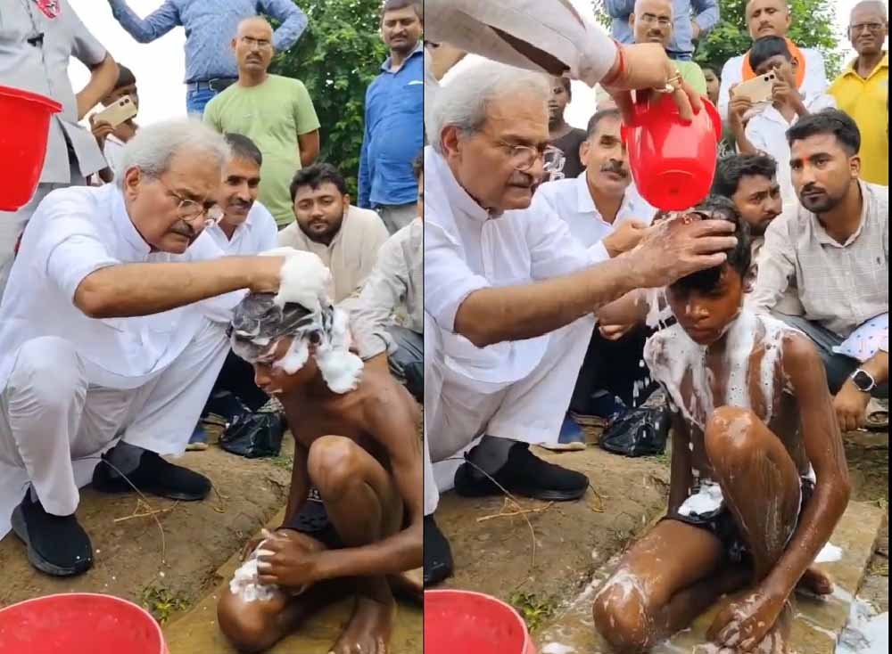 मध्यप्रदेश के रीवा जिले में सांसद जनार्दन मिश्रा का अनोखा अंदाज देखने को मिला। सेवा पखवाड़ा कार्यक्रम के तहत मंगलवार को वे बड़ागांव पंचायत पहुंचे, जहां उन्होंने मुसहर समाज के बच्चों को खुद नहलाया, उनके नाखून काटे और गंदे कपड़े भी धोए।