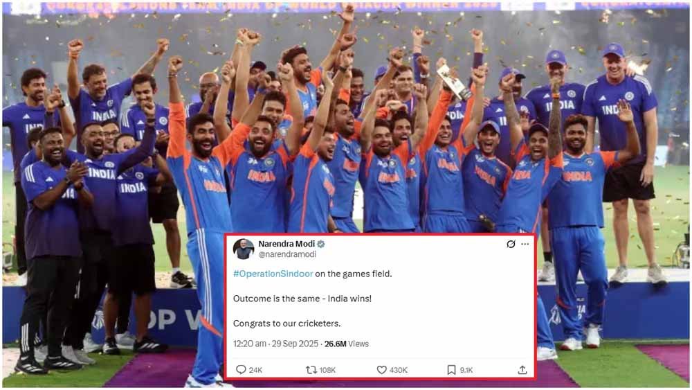 पीएम मोदी ने एक्स पोस्ट में लिखा, "खेल के मैदान पर ऑपरेशन सिंदूर, परिणाम वही- भारत की जीत! हमारे क्रिकेटरों को बधाई।" रविवार को खेले गए खिताबी मुकाबले में पाकिस्तानी टीम 19.1 ओवरों में महज 146 रनों पर सिमट गई थी। पाकिस्तान के लिए साहिबजादा फरहान ने सर्वाधिक 57 रन बनाए, जबकि फखर जमां ने 46 रन की पारी खेली। भारत की ओर से कुलदीप यादव ने 4 विकेट झटके, जबकि जसप्रीत बुमराह, वरुण चक्रवर्ती और अक्षर पटेल ने 2-2 शिकार किए।