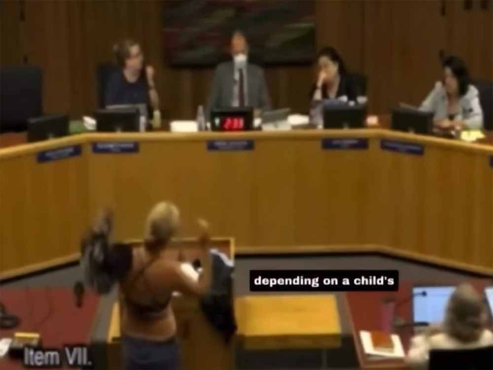 कपड़े उतारने हुए महिला कहने लगी, “मैं डेविस यूनिफाइड स्कूल डिस्ट्रिक्ट की एक अभिभावक हूं, और मैं आज यहां जूनियर हाई स्कूलों के लॉकर रूम के लिए आपकी नीतियों पर बात करने आई हूँ। एमर्सन, होम्स, हार्पर जूनियर हाई। अभी, हम अपने छात्रों को फिजिकल एजुकेशन की क्लासेस के लिए कपड़े उतारने के लिए कहते हैं। इसलिए मैं आपको बस यह बताने जा रही हूं कि जब मैं कपड़े उतारती हूं तो उन्हें कैसा लगता है।”