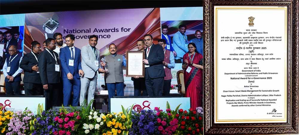 राष्ट्रीय ई-गवर्नेस पुरस्कार 2025 (जूरी) के लिए नगर पालिका परिषद, ललितपुर को उत्तर प्रदेश में सतत विकास हेतु स्मार्ट अपशिष्ट प्रबंधन के लिए चयनित किया गया है, जिसके लिए तत्कालीन #जिलाधिकारी IAS अक्षय त्रिपाठी जो अब बहराइच के #कलेक्टर है और ललितपुर अपर जिलाधिकारी वित्त एवं राजस्व #PCS अंकुर श्रीवास्तव, को पुरस्कार कार्मिक, लोक शिकायत और पेंशन राज्य मंत्री डॉ. जितेंद्र सिंह द्वारा आंधप्रदेश के जिला विशाखापट्नम में आयोजित कार्यक्रम में भारत सरकार के प्रशासनिक सुधार और लोक शिकायत विभाग द्वारा श्रेणी-राष्ट्रीय ई-गवर्नेस पुरस्कार, प्रधानमंत्री उत्कृष्टता पुरस्कार, अन्य केन्द्रीय मंत्रालयों द्वारा प्रदान किए गए पुरस्कारों जैसी सफल राष्ट्रीय स्तर की पुरस्कृत परियोजनाओं की पुनरावृत्ति और उनके विचार के लिए नगर पालिका परिषद, ललितपुर उत्तर प्रदेश को स्वच्छ भविष्य ललितपुर, उत्तर प्रदेश में सतत विकास हेतु स्मार्ट अपशिष्ट प्रबंधन के लिए नगर पालिका परिषद, ललितपुर को राष्ट्रीय-ई-गवर्नेस पुरस्कार 2025 (जूरी) से सम्मानित किया गया है