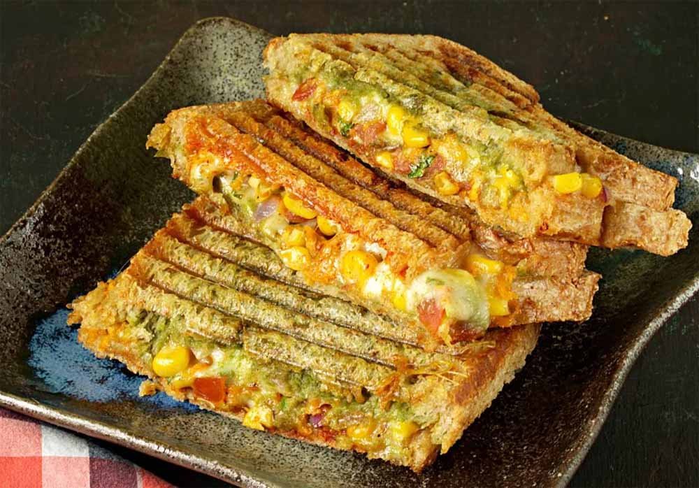 गरमा-गरम कॉर्न सैंडविच को तिकोने टुकड़ों में काटें और हरी चटनी, टोमैटो केचप या चीज डिप के साथ परोसें।