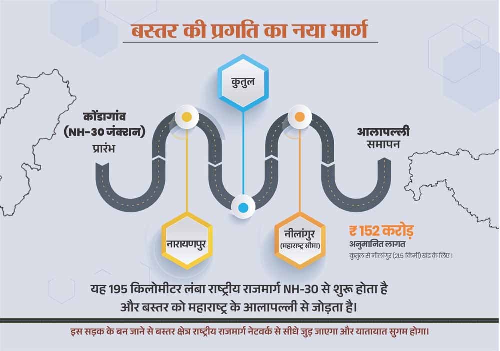यह उल्लेखनीय है कि कुतुल, नारायणपुर जिले के अबूझमाड़ क्षेत्र में स्थित है और कुतुल से महाराष्ट्र सीमा पर स्थित नीलांगुर की दूरी 21.5 किलोमीटर है। यह नेशनल हाईवे 130-डी का हिस्सा है। इस सड़क का निर्माण टू-लेन पेव्ड शोल्डर सहित किया जाएगा।