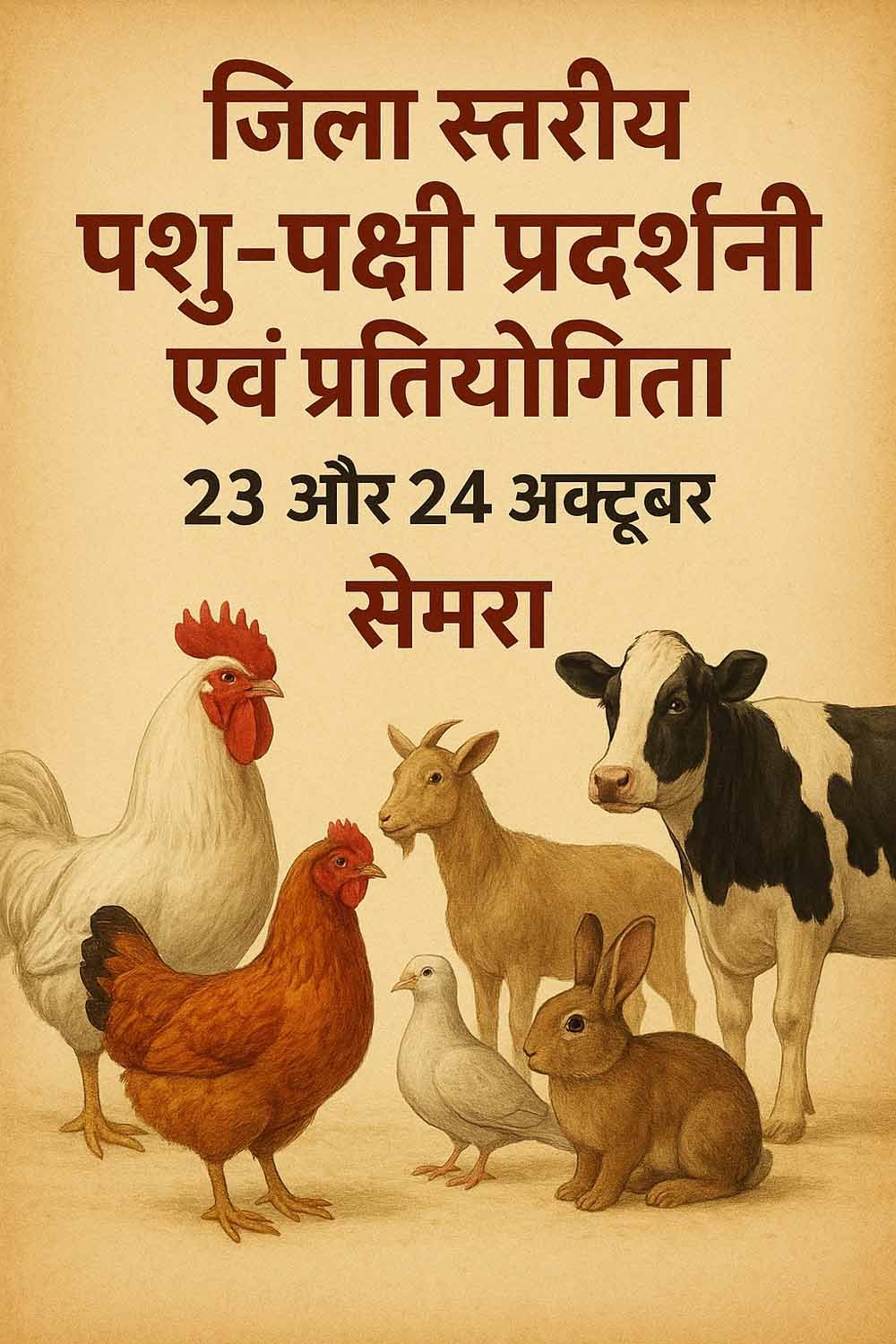 पशु चिकित्सा सेवाएं विभाग के सौजन्य से जिला स्तरीय पशु पक्षी प्रदर्शनी एवं प्रतियोगिता का आयोजन ग्राम सेमरा में स्वामी आत्मानंद स्कूल के पास 23 और 24 अक्टूबर को सुबह समय 10 बजे से अपरान्ह 3 बजे तक आयोजित किया जा रहा है। प्रतियोगिता में सभी कृषको एवं पशुपालको से आग्रह किया गया है कि अधिक से अधिक संख्या में उपस्थित होकर कार्यक्रम को सफल बनाएं। 23 अक्टूबर को प्रदर्शनी का उद्घाटन, वतस्य एवं कृषकों से परिचर्चा होगी। 24 अक्टूबर को विभिन्न प्रजाति, नस्ल, आयु समूह तथा उपयोगिता आधारित पशु पक्षी प्रदर्शनी एवं प्रतियोगिता का आयोजन किया जाएगा, जिसमें दुधारू गाय भैंस प्रदर्शनी एवं प्रतियोगिता, उन्नत बछिया प्रदर्शनी एवं प्रतियोगिता, स्वस्थ बछड़ा बछिया प्रदर्शनी एवं प्रतियोगिता, सांड प्रदर्शनी एवं प्रतियोगिता, बैल भैंस प्रदर्शनी एवं प्रतियोगिता, मुर्गी बतख, जापानी बटेर पक्षी प्रदर्शनी एवं प्रतियोगिता, उन्नत बकरा बकरी प्रदर्शनी एवं प्रतियोगिता, उन्नत सूकर प्रदर्शनी एवं प्रतियोगिता और विभिन्न प्रतियोगिताओं के पुरस्कार विजेताओं को वितरण किया जाएगा।