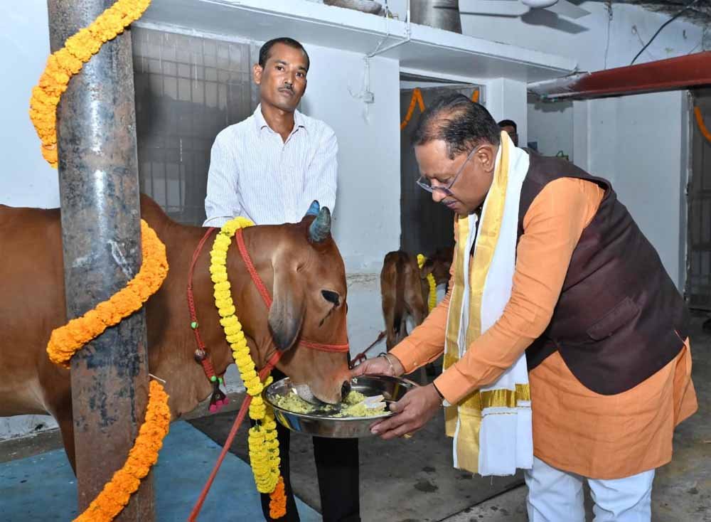 मुख्यमंत्री श्री विष्णु देव साय ने आज मुख्यमंत्री निवास रायपुर में स्थित गौशाला में गोवर्धन पूजा के अवसर पर गौमाता की पूजा-अर्चना की और गौ माता को खिचड़ी खिलाकर गोसेवा की परंपरा निभाई। उन्होंने इस अवसर पर प्रदेशवासियों की सुख-समृद्धि, शांति और खुशहाली की मंगलकामना की। मुख्यमंत्री श्री साय ने कहा कि गोवर्धन पूजा प्रकृति, गौवंश और पर्यावरण के प्रति आभार व्यक्त करने का पावन पर्व है। मुख्यमंत्री ने प्रदेशवासियों को गोवर्धन पूजा की हार्दिक शुभकामनाएं दी।