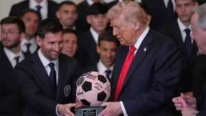 लियोनेल मेस्सी ने डोनाल्ड ट्रंप को रत्नजड़ित गुलाबी फुटबॉल भेंट की